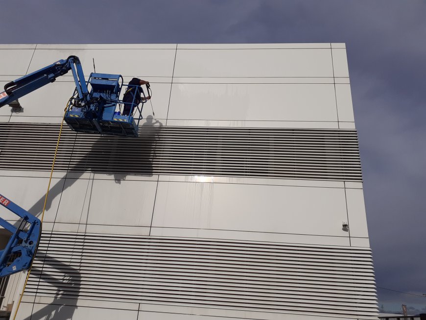 Neteja d' alçada amb elevador, fent servir desengreixant específic pel tipus de superfície. #netejadalçada